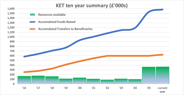 The above chart, updated in November 2025, is an ‘at a glance’ illustration of the KET finances over the last ten years. The blue line shows the big rise in funds raised, thanks in the main to a most generous legacy last year; the brown line, remaining flat from ’23 to ’25, reflects the absence of the necessary FCRA licence and the associated frustration in not being able to send monies to our beneficiaries. The contrasting trajectories of these two lines explains the very material rise in ‘Resources available’ (blue/green columns).